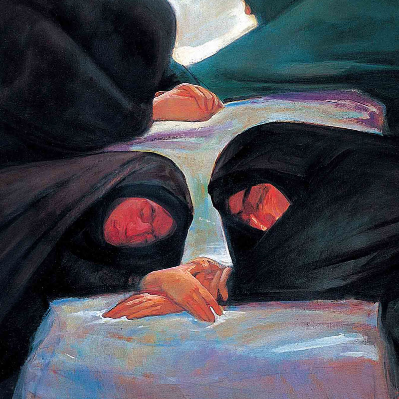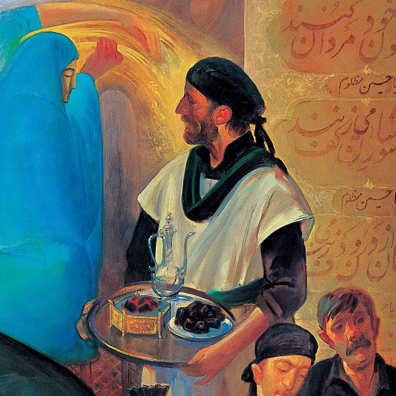 زنها مشغول سوگواری بر پیکرهایی هستند. در گوشه دیگر از تابلو مردها بر سینه خود می زنند و فردی ایستاده با گلاب و خرما و اسفند در دست به درون تابلو می نگرد. این مرد کلید ورود بیینده به بخش دوم نقاشی است بخشی که گویی در زمین نقاشی نشده است . سر دو شهید در میانه تابلو قرار دارد که باکمی توجه متوجه می شویم که همان دو فیگوری هستند که در بالای تابلو میهمان بزرگی هستند که ساحت آسمانی دارد.