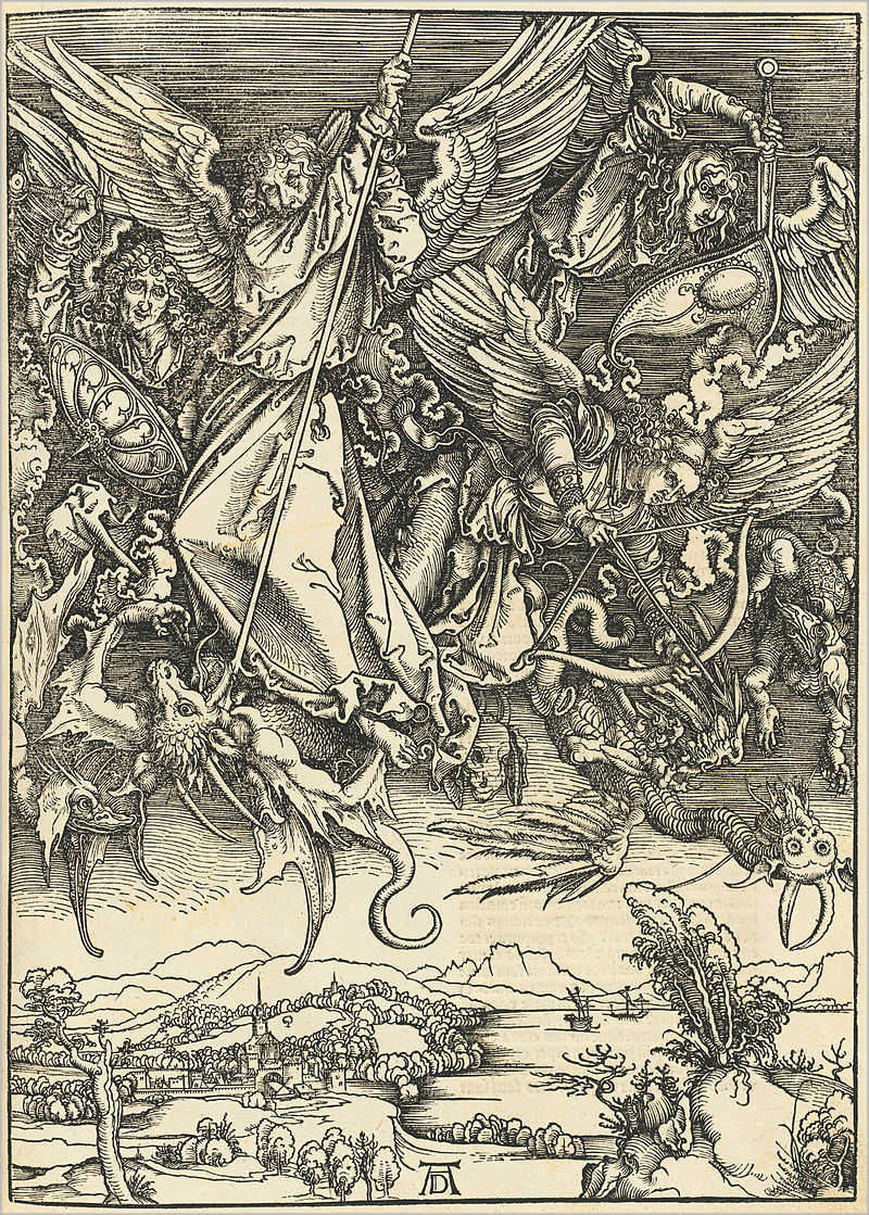 "دورر"، برای بازنمایی این لحظه بزرگ، همه آن حالت گیری های سنتی را کنار نهاد که برای بازنمایی جنگ یک قهرمان در برابر حرفی خطرناک و مهلک، با جلوه ای از آراستگی و آسوده حالیف بارها و بارها استفاده شده بودند. قدیس و میکاییلی که "دورر" تصویر کرده است هیچ ژست و حالتی را نشان نمی دهد و در نهایت خشکی و جدیت است. او از هردو دست خود در تقلایی زور ورزانه برای فرو بردن نیزه اش در گلوی اژدها استفاده می کند، و این نمایش قدرت، تمامی صحنه را تحت تاثیر قرار داده است. پیرامون او چندین و چند ملایک جنگنده دیگر با شمشیر و کمان در برابر غولان خونخواری که ظاهر غریبشان از حد هر توصیفی در می گذرد، در حال نبردند. در زیر این صحنه کارزار آسمانی، چشم انداز آسوده و آرامی با مونوگرام معرف دورر دیده می شود.