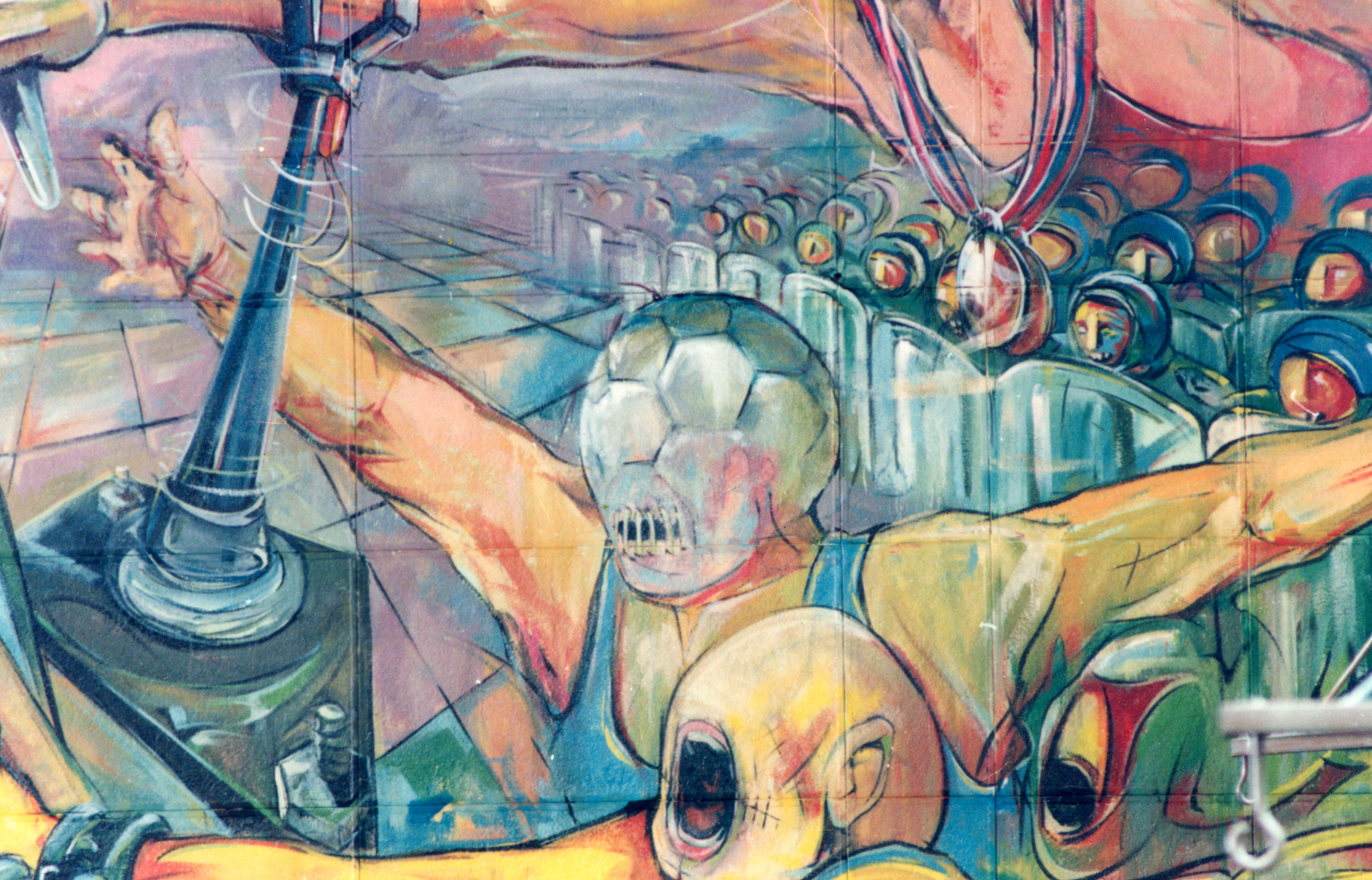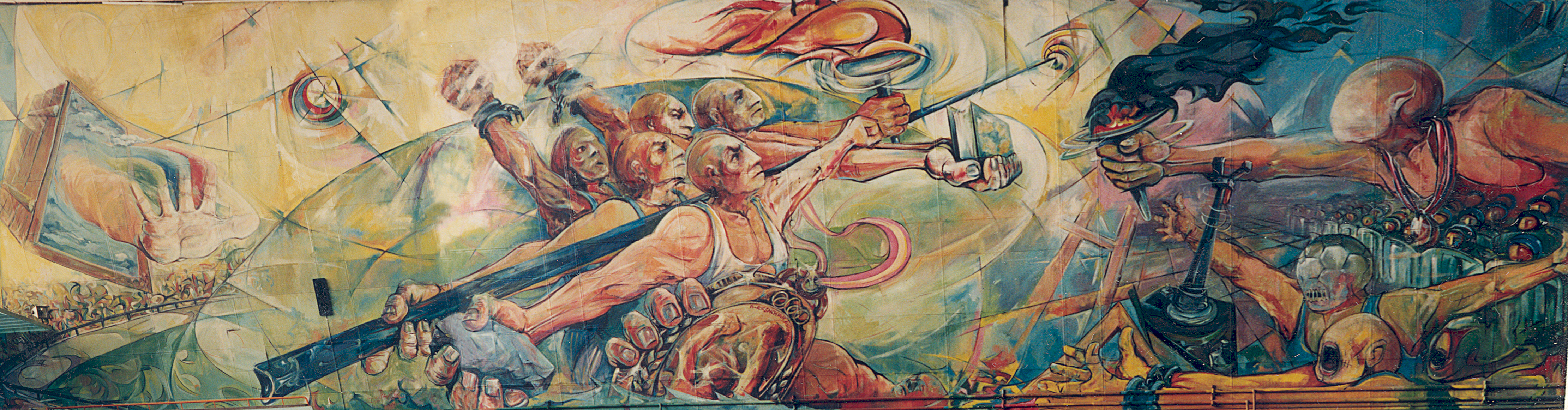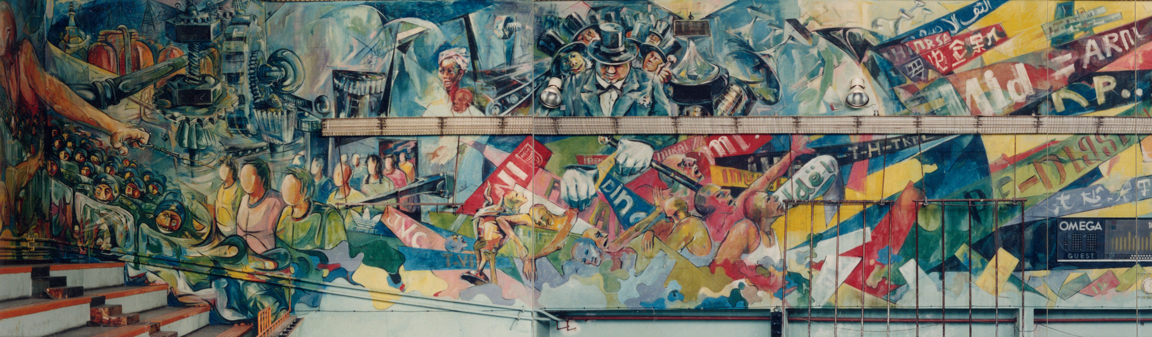 بیانیه ورزشی(بخشی از اثر)، علی اصغر کفشچیان مقدم، رنگ و روغن روی دیوار، 1080 متر مربع، 1366-1369