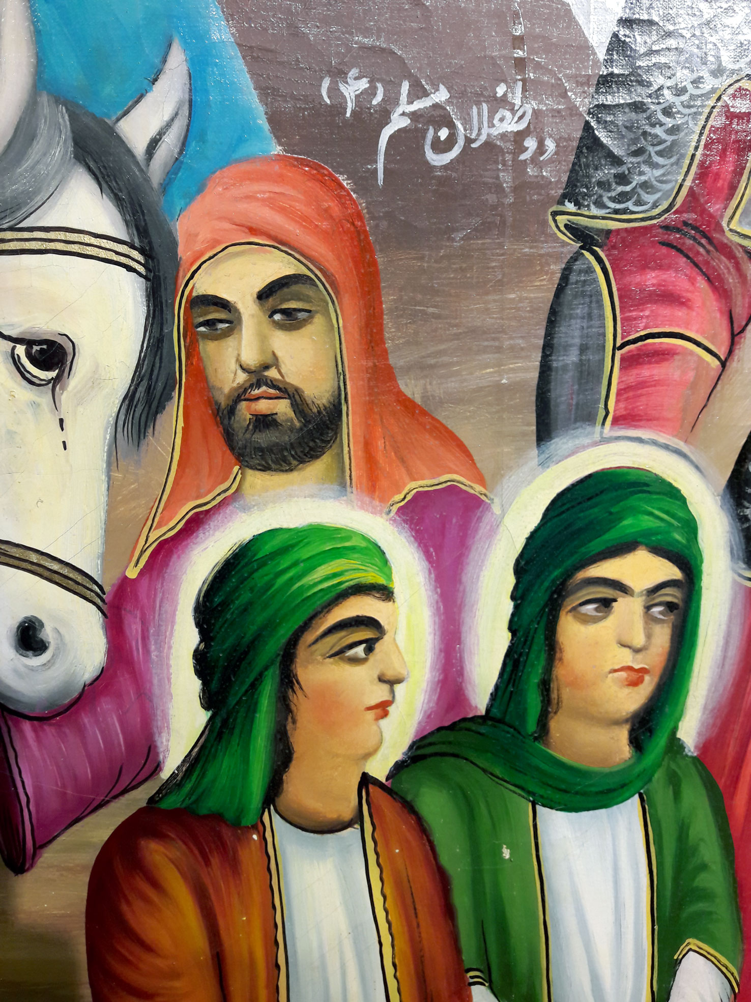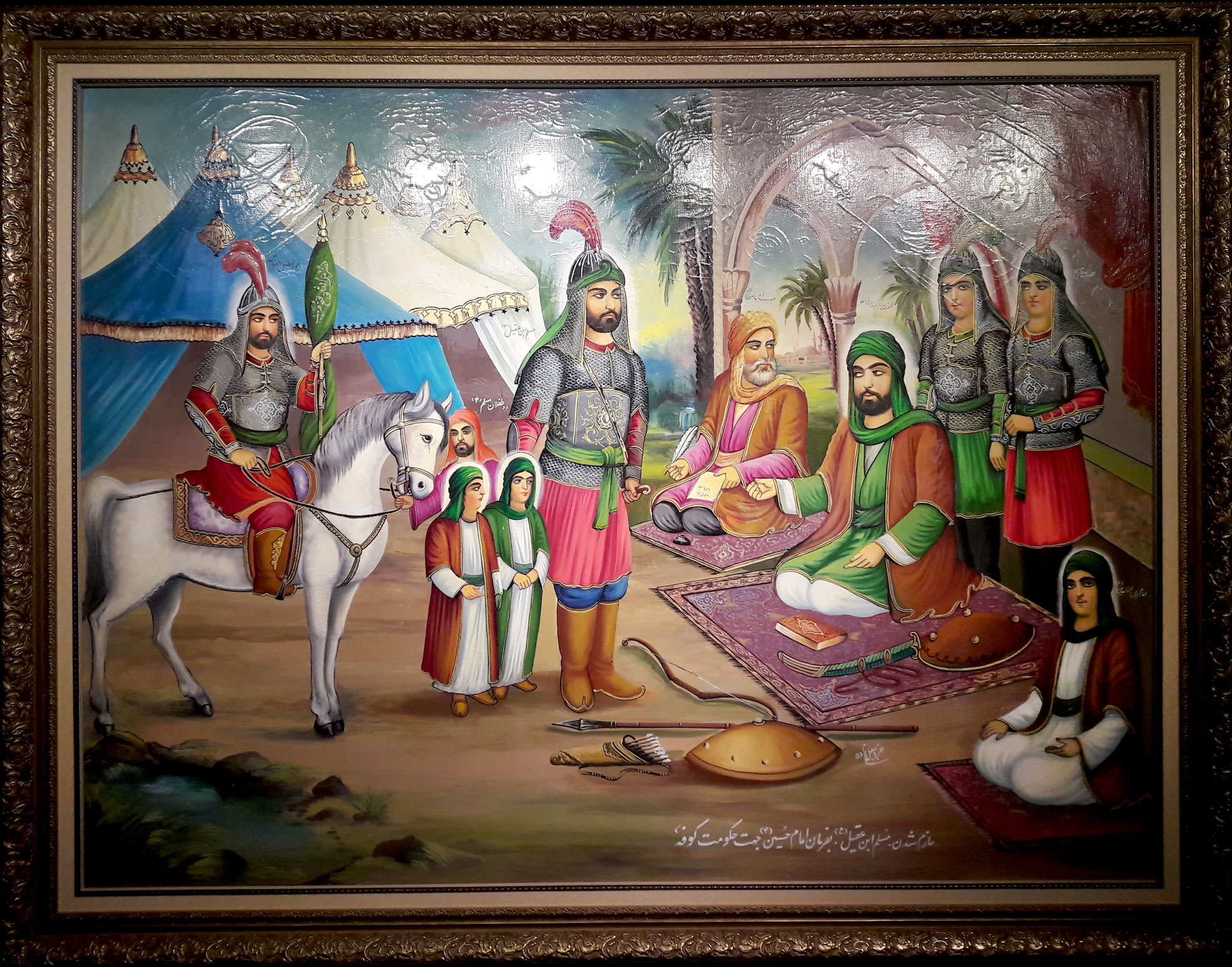 این تابلوی نقاشی که توسط استاد چلیپا به سبک نقاشی قهوهخانهای در سال 1376 و در ابعاد 150 در 200 با تکنیک رنگ و روغن خلق شده است، صحنه دیدار مسلم بن عقیل با امام حسین(ع) را نشان میدهد در حالی که به فرمان ایشان قصد حرکت به سمت حکومت کوفه را دارد تا با مردم آن شهر که با ارسال نامههای فراوان امام را دعوت و حمایت کرده بودند دیدار کرده و پاسخ امام را به آنان ابلاغ کند.