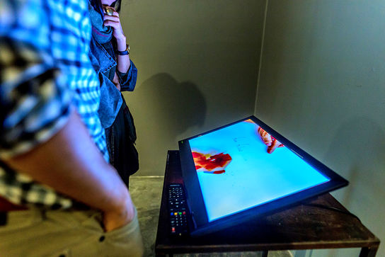 این مجسمهساز افزود: جای دیگری فرم صدای من به کار رفته است زیرا صدای افراد هم متفاوت است و صدای هر شخص ویژگیهای خاصی دارد. من صدای فریاد خود را ضبط کرده و به یک نرمافزار صدا دادم تا آن را به خطوط و رنگها تبدیل کند. سپس یک بخش از تصاویری که توسط نرمافزار به وجود آمده بود را انتخاب کرده و روی بومی بزرگ نقاشی کردم. مخاطب ممکن است آن را یک اثر نقاشی بداند اما در واقع فریاد من را مشاهده میکند.