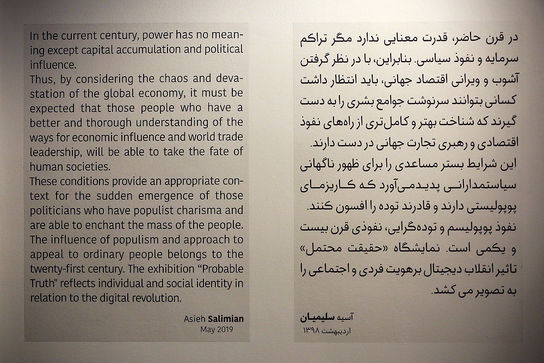 به گزارش روابط عمومی مرکز تجسمی حوزه هنری به نقل از هنر آن لاین، نمایشگاه گروهی "حقیقت محتمل" با کیوریتوری آسیه سلیمیان در گالری ویستا برپاست. سلیمیان درباره شکلگیری ایده این مجموعه گفت: زمانی که ترامپ تهدید به حمله نظامی علیه ایران را آغاز کرد، من در ایران نبودم اما بسیار پیگیر اخبار بودم و به این فکر میکردم که چه اتفاقی در ایران خواهد افتاد. این موضوع برایم چالشی درست کرد و به این فکر کردم که این آدم قدرت خود را از چه طریقی استفاده میکند که میتواند روی اشخاصی مثل من که همیشه برای رصد کردن فضای رسانه وقت میگذارم، تأثیر بگذارد.