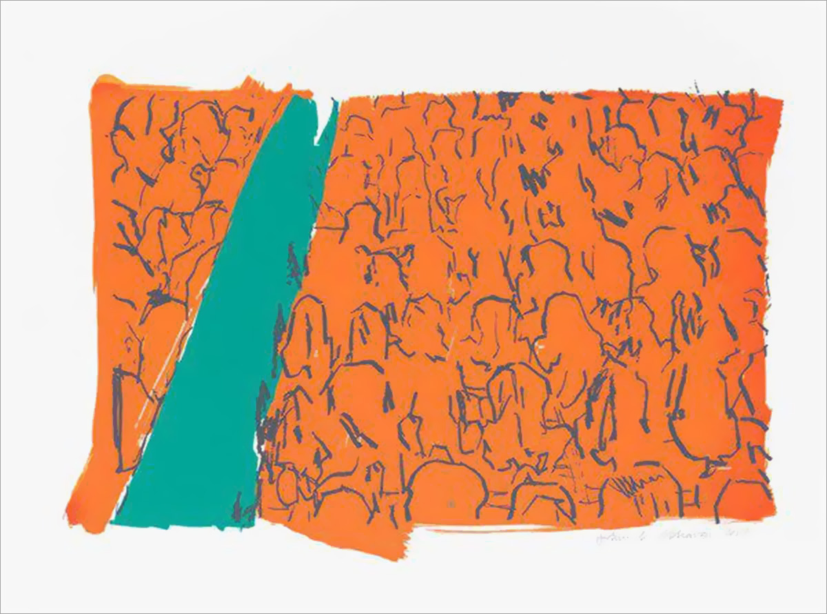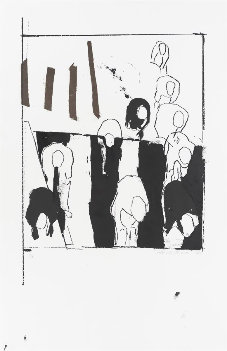 نماز از لحاظ بصری یک مراسم منظم و منظوم است. نمازگزاران در ردیفهایی که شبکه ایجاد میکنند قرار دارند. فضای هر فرد با سجادهای مستطیل شکل مشخص میشود. اشکال انسانی تمایز خود را از دست میدهند. با این حال، فضای بین نمازگزاران برجسته میشود. نوعی زیباییشناسی ارگانیک وجود دارد که بین فضا و انسان پدید میآید، بدین پارچهها و رنگ لباس افراد ترکیبی چون تصویری از پارچههای مصنوعی به جود میآید - نوعی اختلاط.