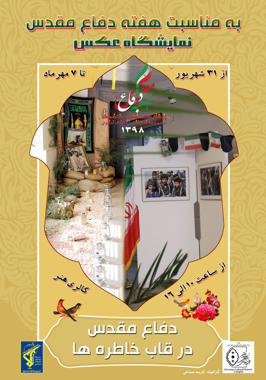 نمایشگاه دفاع مقدس در قاب خاطرهها تا روز یکشنبه هفتم مهر ماه همه روزه از ساعت ۱۰ تا ۱۶ در محل گالری هنر مجموعه فرهنگی تاریخی نیاوران واقع در میدان شهید باهنر (نیاوران) میزبان علاقهمندان است.