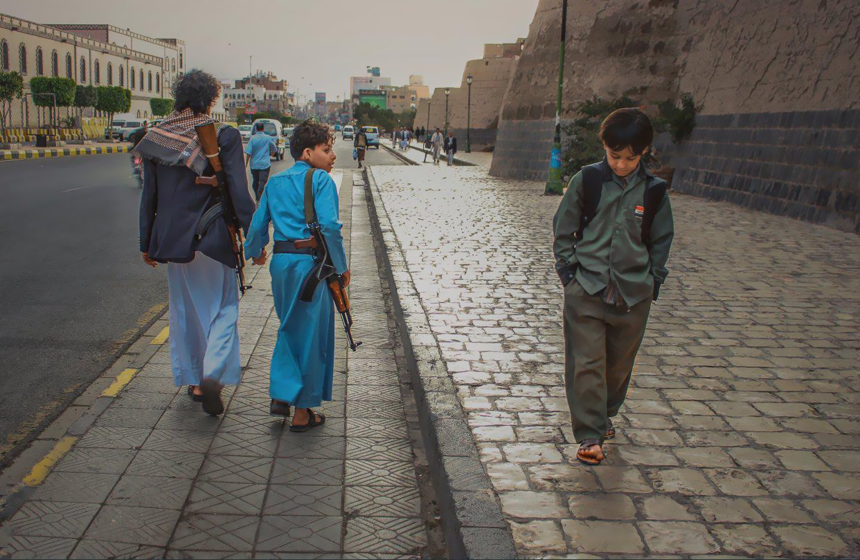 اینجا یکی از خیابانهای قدیمی شهر صنعاست. کودکی در حال بازگشت از مدرسه است و در حالی که کولهپشتی روی دوشش انداخته، عمیقا فکر میکند. شاید در فکر آینده است و روزهای نامعلومی که انتظارش را میکشند. درست در همان لحظه کودکی کلاشنیکف به دوش در حالی که دست پدر مسلح خود را گرفته از کنارش رد میشود و به سمت جنگ میرود.