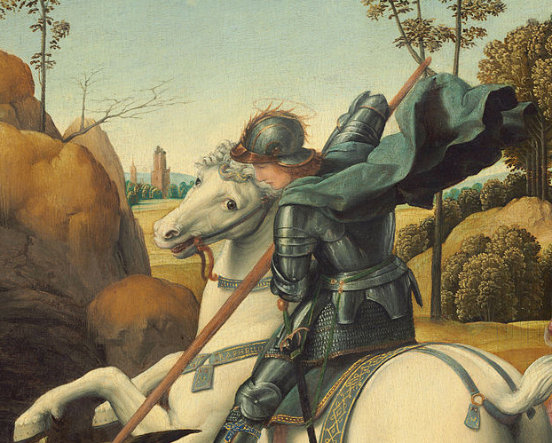 کمتر ممکن است یک پرده نقاشی از لحاظ استحکام ترکیب و طرح اجزا به پایه این اثر "رافائل"، با عنوان "سن ژرژ و اژدها" برسد. ملاحظه کنید چگونه پیچ و تاب بدن اژدها در منحنی های عضلات اسب و چتر درختان و برآمدگی های تخته سنگ منعکس می گردد؛ و از طرف دیگر خطوط قایم تنه درختان و برج دورافتاده و بازو و زانوی سن ژرژ، حرکت مستقیم و محکم نیزه را تایید می کنند.
