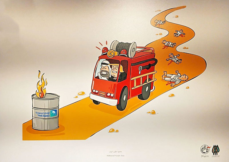 این تناقضی آشکار بود که دیدیم ارزش نفت ، بالاتر ازخون مظلومین یمنی است و فکرکردیم که جا دارد این جریان را به چالش بکشیم. وچه زبانی بهتر و گویاترازکاریکاتورکه هم بین اللملی است ، هم قابل فهم برای عموم و هم می توانست بلافاصله این موضوع را منتقل کند. امروز نیز روز کودک در تقویم جهانی است و غالب آثار هم به موضوع کودکان یمنی در جنگ اشاره دارد، بنابراین افتتاحیه نمایشگاه کاملا آگاهانه و در محکوم کردن کشتار کودکان یمنی برگزار می شود.
