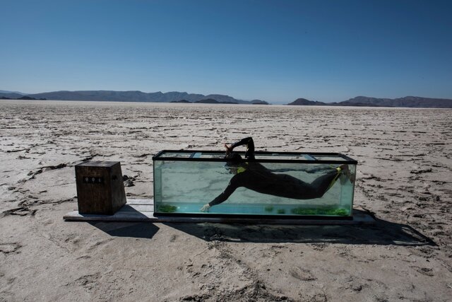انجمن تمدن سبز هنرمندان حامی محیط زیست، پرفورمنس هنری شنا در دریاچه خشک بختگان را طی سه روز اجرا کردند.