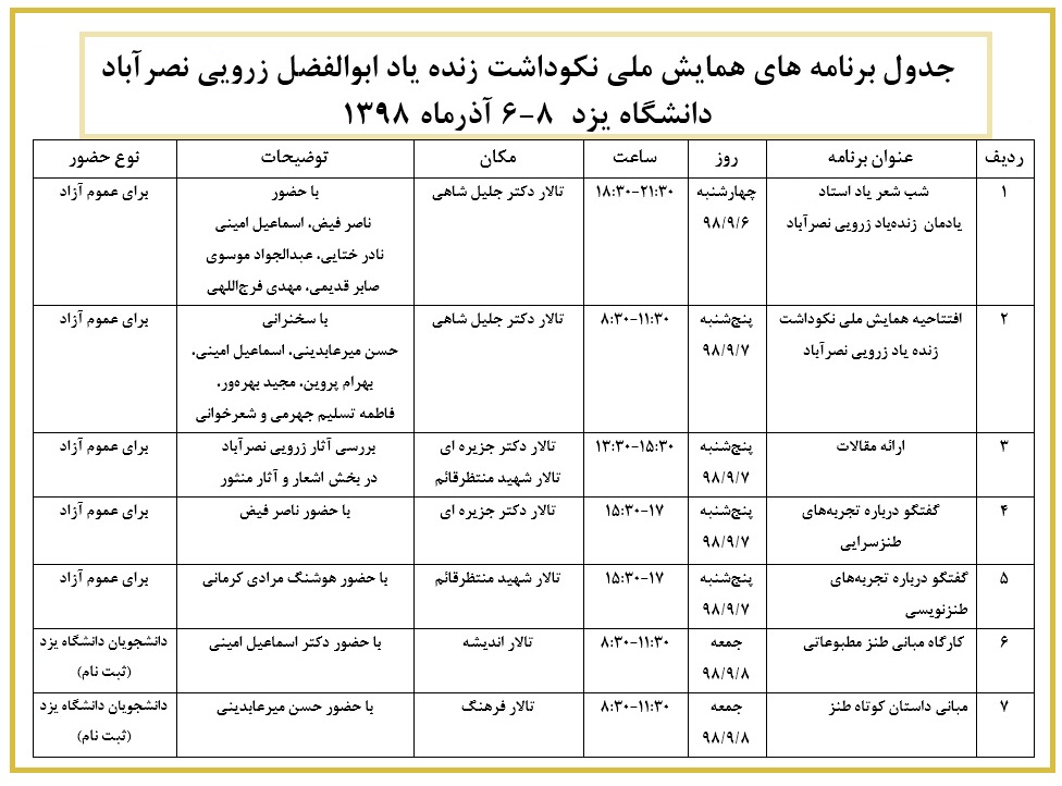 جدول زمان‌بندی همایش ملی نکوداشت زنده‌یاد ابوالفضل زرویی نصرآباد
