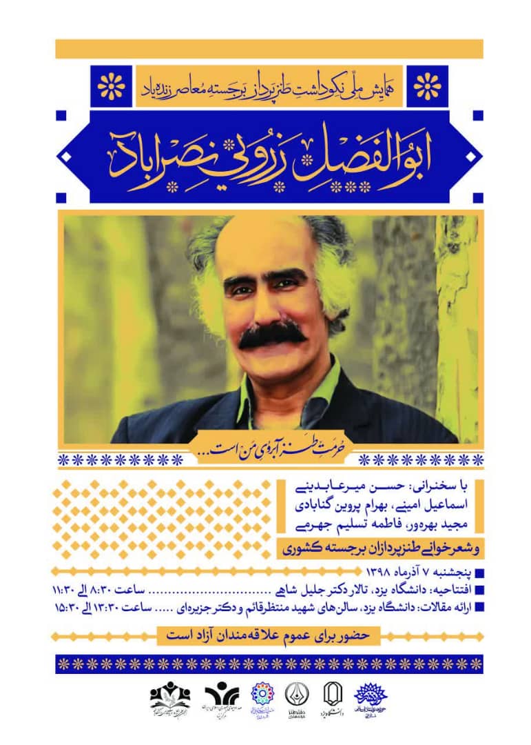 همایش ملی نکوداشت زنده‌یاد ابوالفضل زرویی نصرآباد هم‌زمان با سالگرد درگذشت ایشان با حضور مسئولان، چهره‌های سرشناس طنز و ادبیات کشور، پژوهشگران، نویسندگان، شاعران، هنرمندان و اهالی فرهنگ و ادب ششم تا هشتم آذرماه با همکاری دانشگاه یزد، دفتر طنز حوزه هنری ، حوزه هنری استان یزد و دیگر دستگاه‌ها و نهادهای علمی، فرهنگی استان یزد در دانشگاه یزد برگزار خواهد شد.