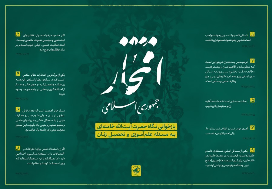 اینفوگرافیک «افتخار جمهوری اسلامی» شامل مروری بر نگاه رهبر معظم انقلاب به مسئله علمآموزی و تحصیل زنان است.