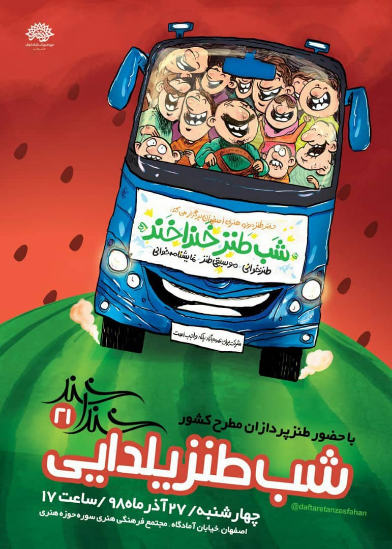 محمد پوررشیدی در این رابطه گفت : دفترطنز حوزه هنری اصفهان ۲۷ آذر ماه به پیشواز شب یلدا میرود. در این برنامه که ساعت ۱۷ در سالن سوره حوزه هنری برگزار خواهد شد. طنزپردازان مطرح استان اصفهان تازهترین آثار خود را در قالب شعر و نثر طنز و استندآپ کمدی ارائه میکنند.