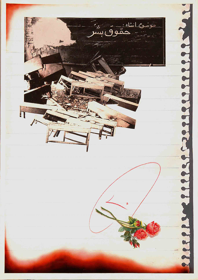 گرافیک دهه اول انقلاب و جنگ را می توان حاصل این ضرورت ها دانست . پوستر پیش رو با کمک گرفتن از تکه چسبانی عکس و قلم ایر براش( قلم بادی ) طراحی و اجرا شده است .