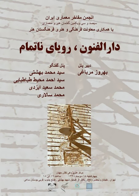 نشست «دارالفنون؛ رؤیای ناتمام» چهارشنبه ۱۸ دی، از ساعت ۱۶ تا ۱۸ در «مرکز هنر پژوهی نقش جهان» با همکاری فرهنگستان هنر برگزار می‌شود و ورود عموم آزاد است.