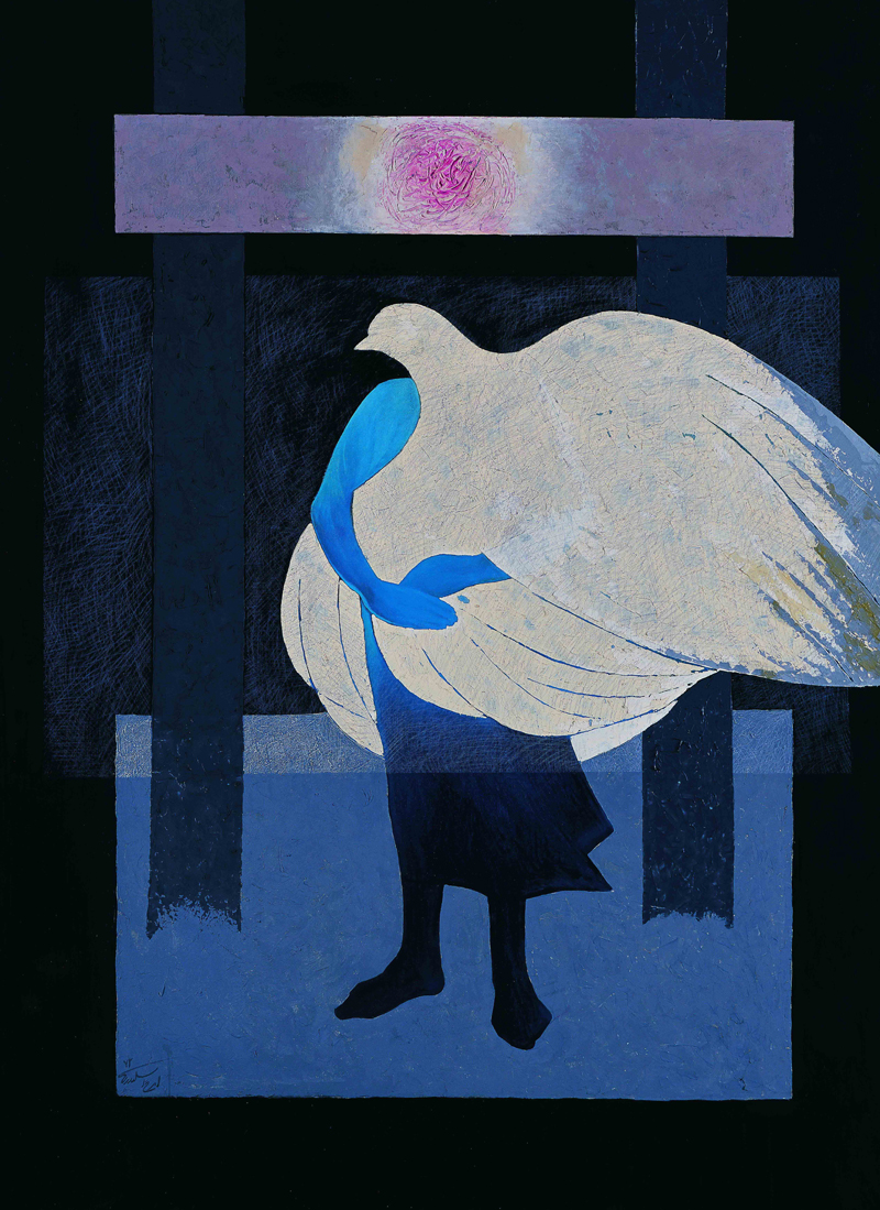 از هنرمندان معاصر دوره ما ایرج اسکندری نقاشی است که همواره به این موضوع توجه ویژه داشته است .تابلوی پیش رو از نقاشی  های این هنرمند است که ما می توانینم سیر تکامل هنر نقاشی اسکندری را به طور واضح در آن مشاهده کنیم. بخشن بندی های موضوعی این نقاشی برپایه اولویت های ترکیب بندی بنا شده است و نقاش توانسته عناصر را به ترتیب از پلن روبرو به سمت داخل نقاشی هدایت کندو با بهره گیری از بافتهای رنگی ریتمی بی بدیل در تابلو خلق کند.