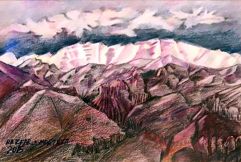 رازفر افزود: در طول ۴۰ سالی که از کوهها نقاشی کشیدم در آنها تصاویری مانند چهره و فیگور انسان، کبوتر و... را دیدم و در نقاشی خود نیز آنها را منتقل میکنم. این اتفاق مانند تصاویری است که در ابرها دیده میشود و شکلهای مختلفی را به ذهن انسان متبادر میکند. ممکن است اگر شخص دیگری در کنار من باشد چنین تصاویری را در کوه و کویر مشاهده نکند اما دقت زیادی که در این سالها به مناظر داشتهام باعث شده است بتوانم شکلهای مختلف را در مناظر تشخیص دهم.