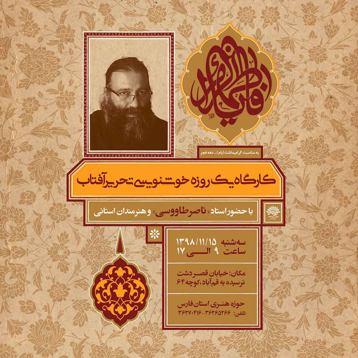 به گزارش روابط عمومی حوزه هنری استان فارس، امیرحسین عبادیان ضمن بیان این خبر اظهار داشت: روز سه شنبه 15 بهمن ماه کارگاه یک روزه خوشنویسی "تحریر آفتاب" در حوزه هنری فارس برگزار شد.